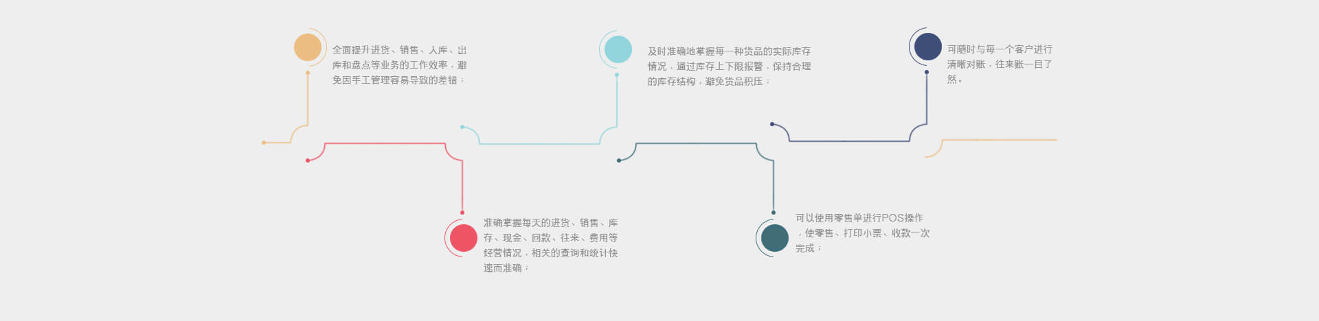 准确掌握每天的进货、销售、库存、现金、回款、往来、费用等经营情况,相关的查阅和统计快速而准确。